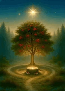 because the red berries are said to carry the memory of Christ’s blood,a sign of protection,a sign of love held close to the earth.Some call it the Lady’s Tree,because she stands at thresholds,guarding the old paths,keeping watch where the worlds touch.Long before that,